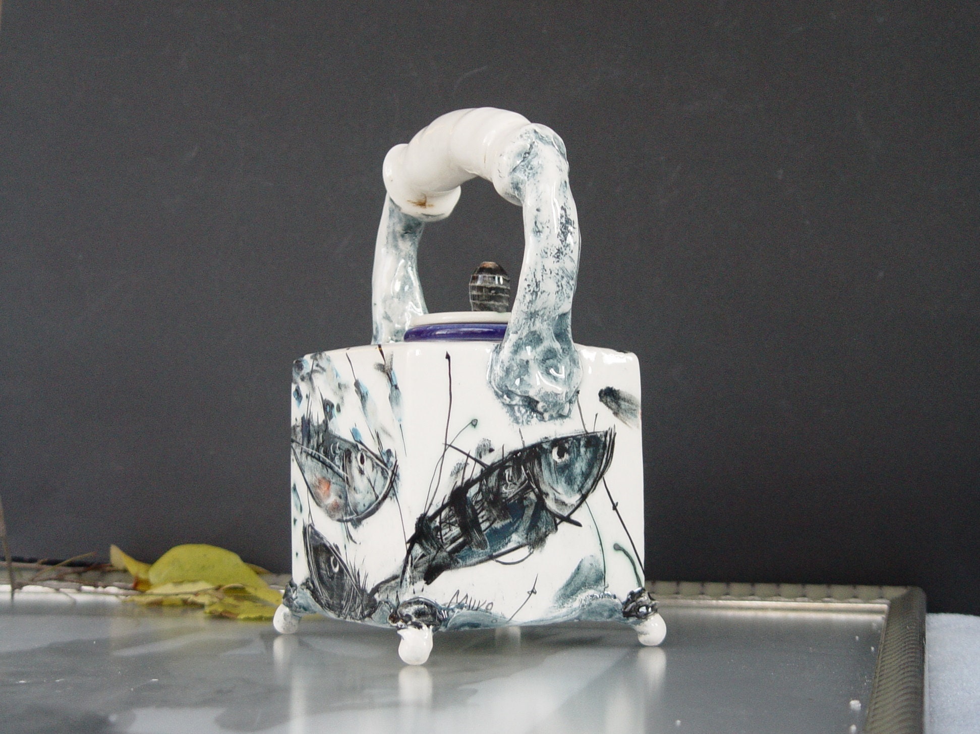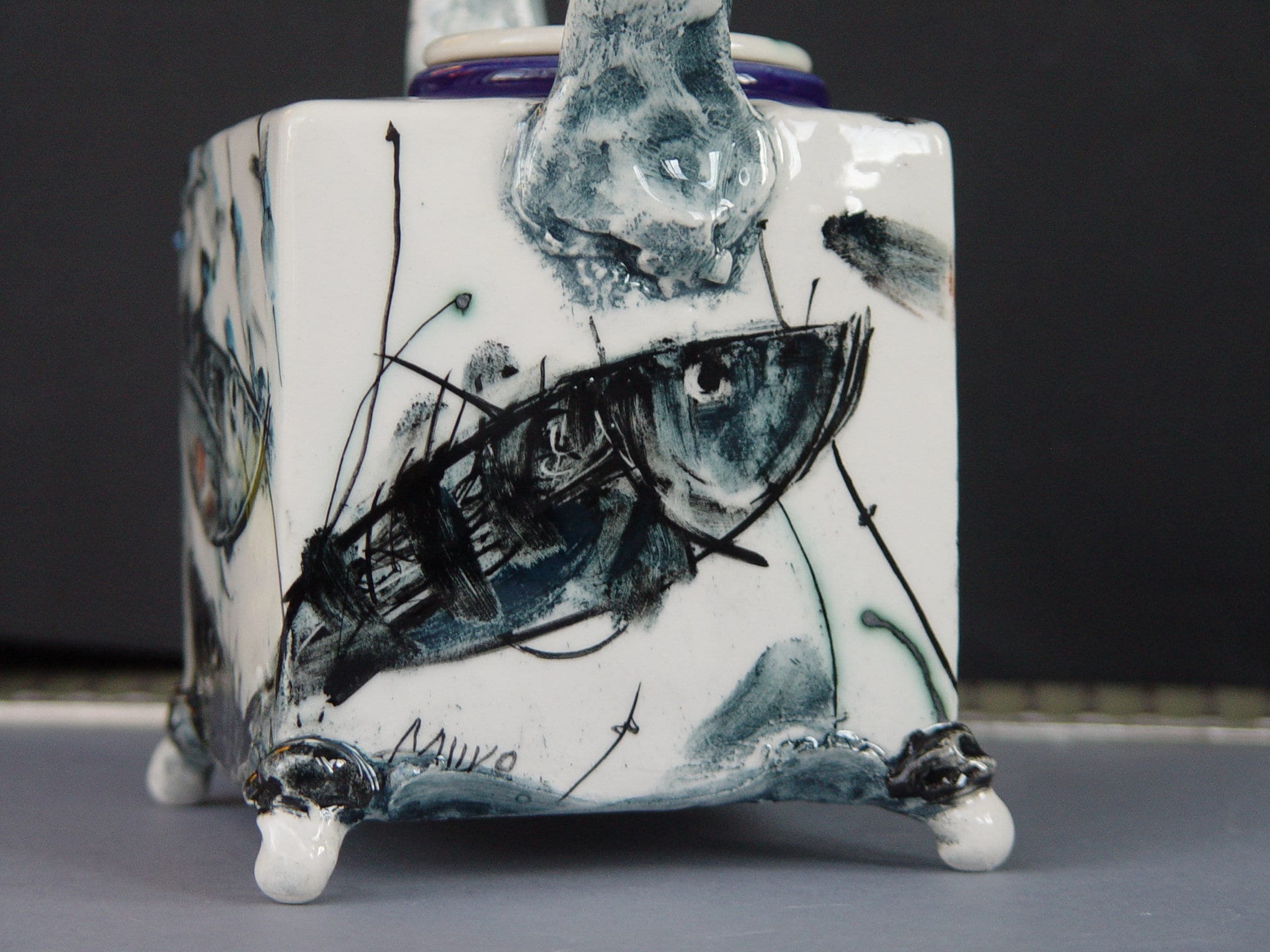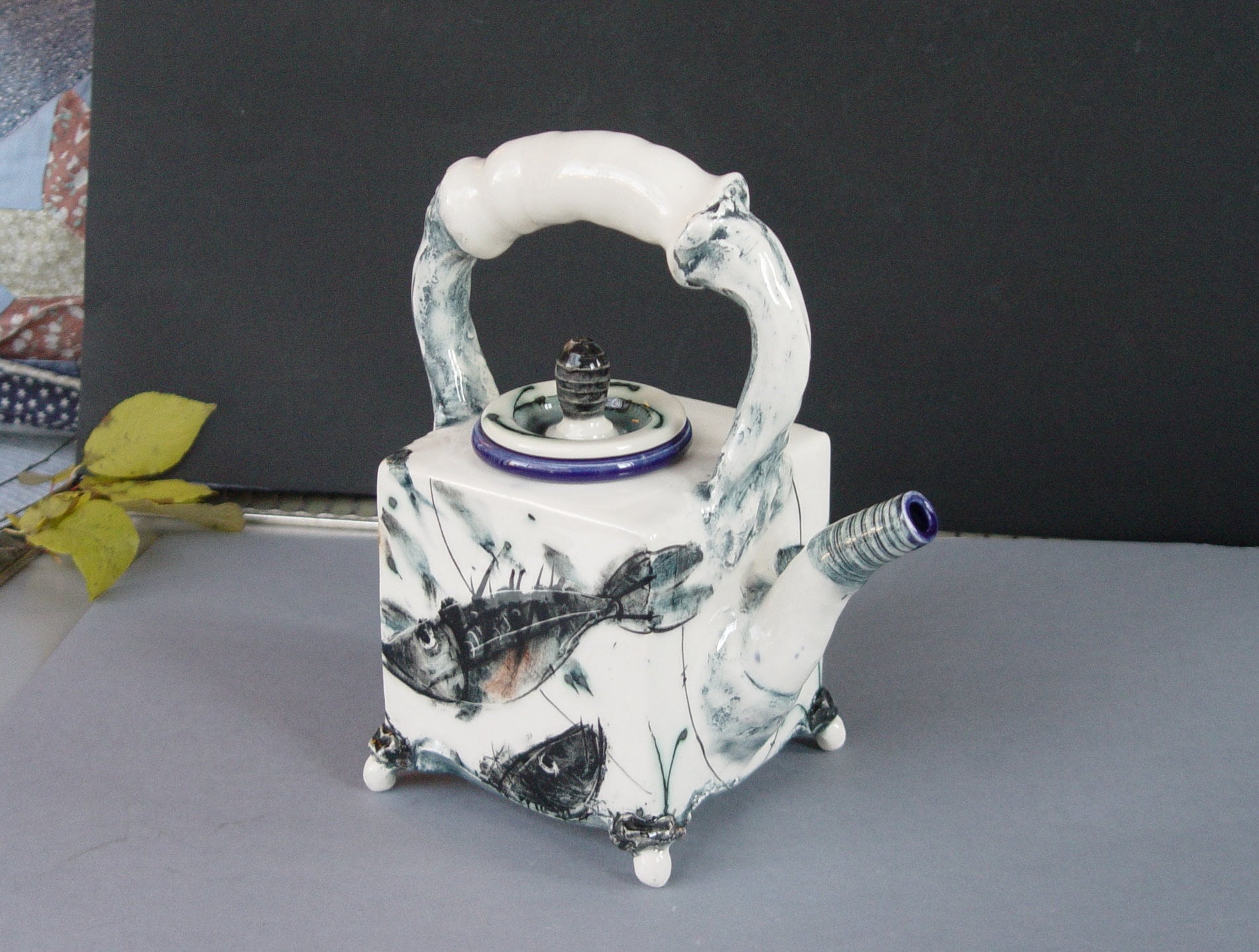 Elevate your tea experience with this handmade pottery square teapot featuring a distinctive fish design. Crafted with care in Bulgaria, this slip-casted porcelain masterpiece boasts a wheel-thrown handle, ceramic strainer, and vibrant underglaze paints. The entire process, from clay preparation to kiln removal, is a labor of love, ensuring each teapot is one of a kind.