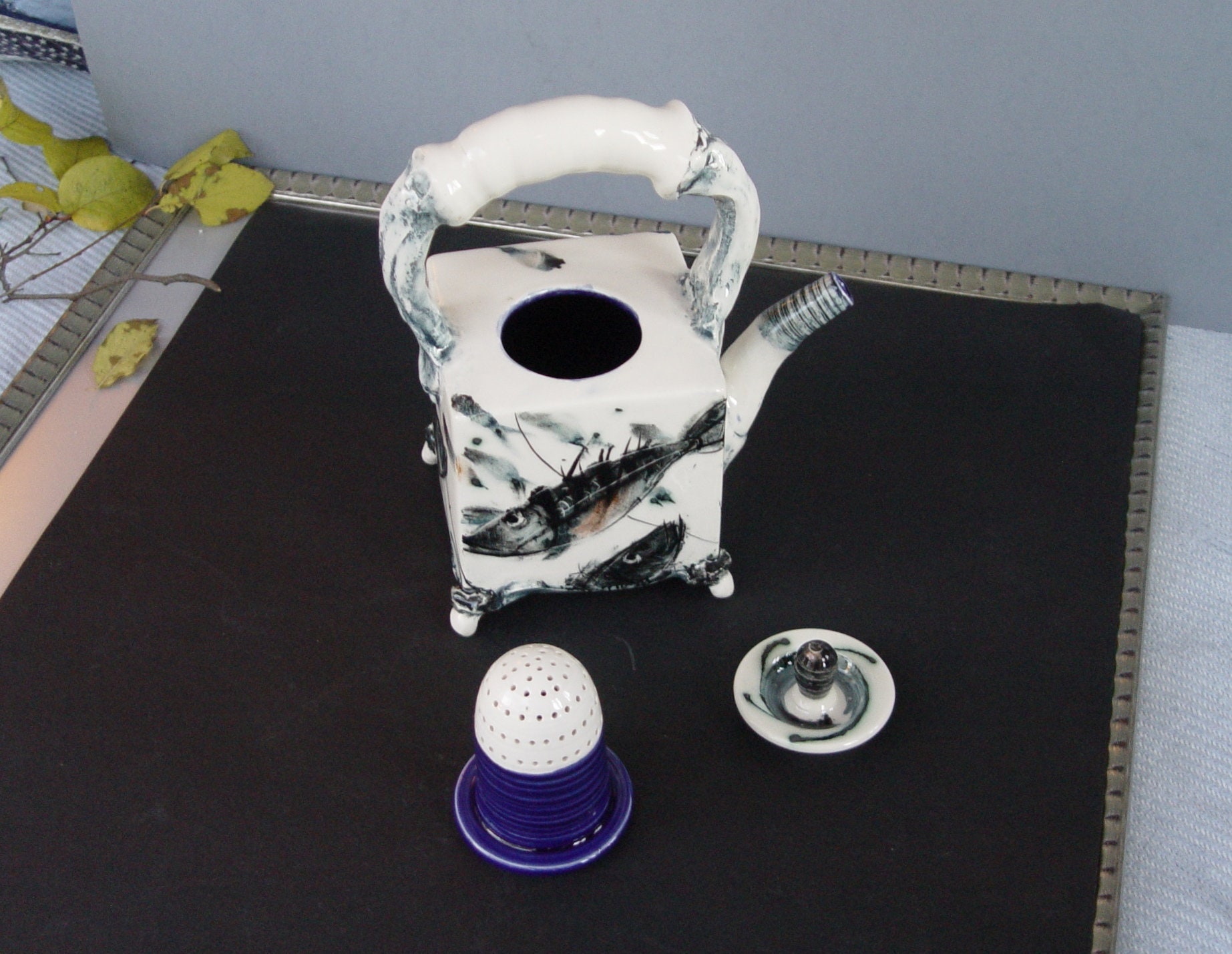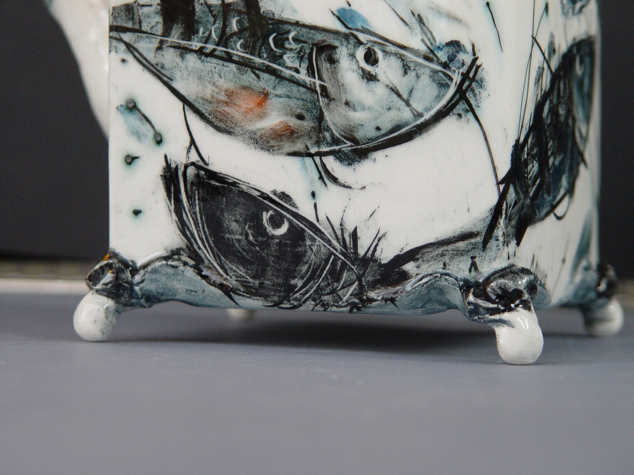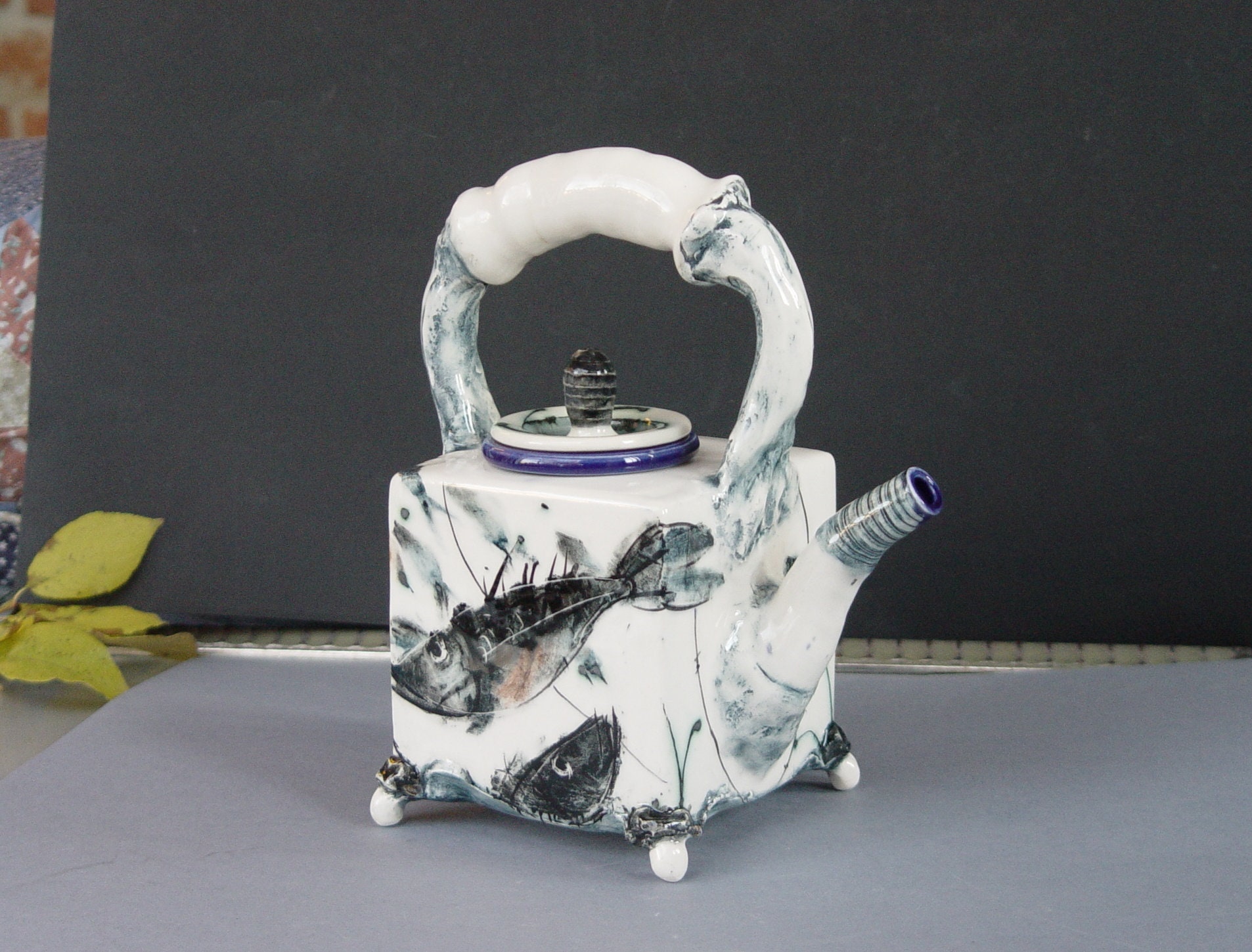 Elevate your tea experience with this handmade pottery square teapot featuring a distinctive fish design. Crafted with care in Bulgaria, this slip-casted porcelain masterpiece boasts a wheel-thrown handle, ceramic strainer, and vibrant underglaze paints. The entire process, from clay preparation to kiln removal, is a labor of love, ensuring each teapot is one of a kind.