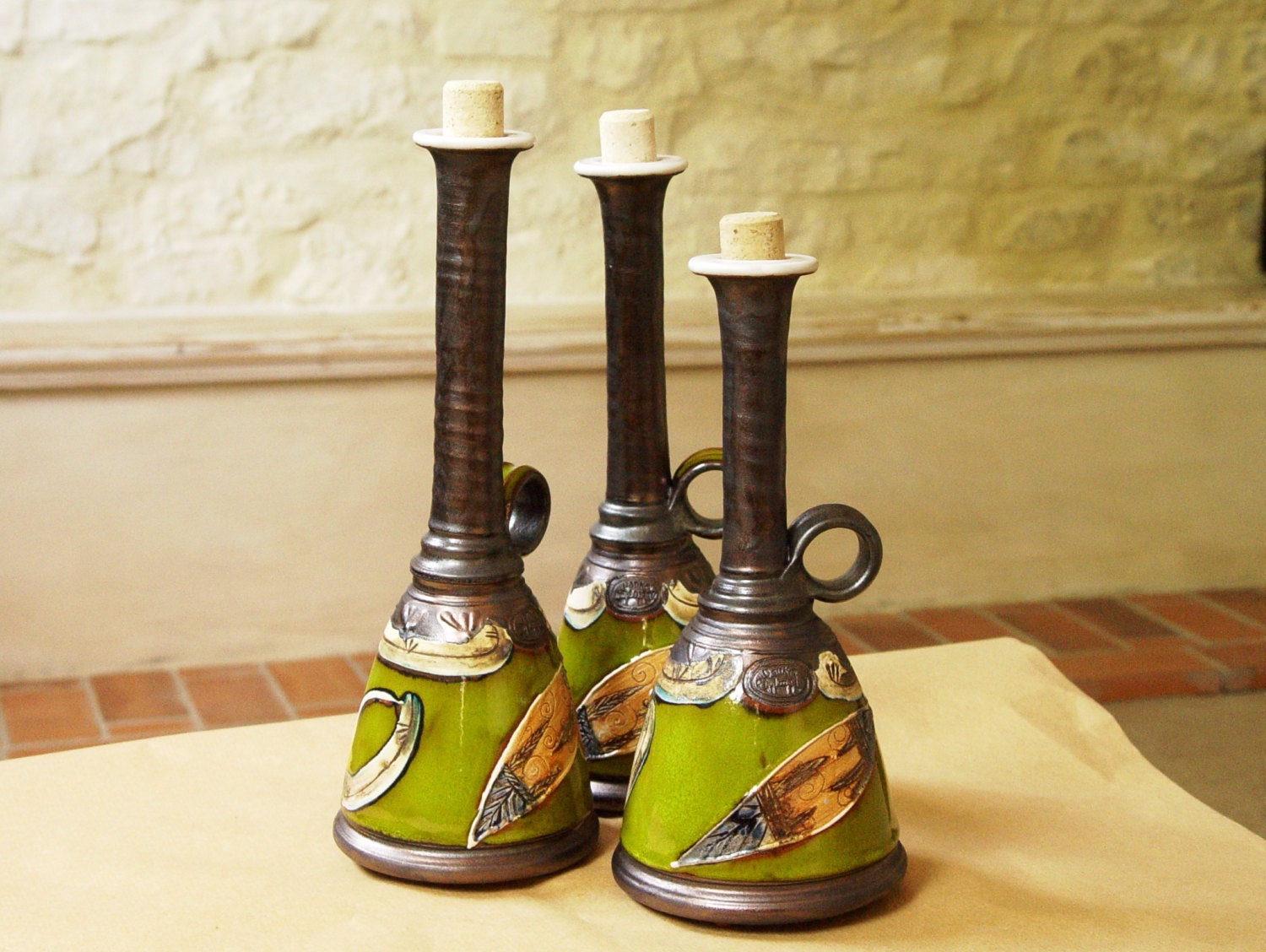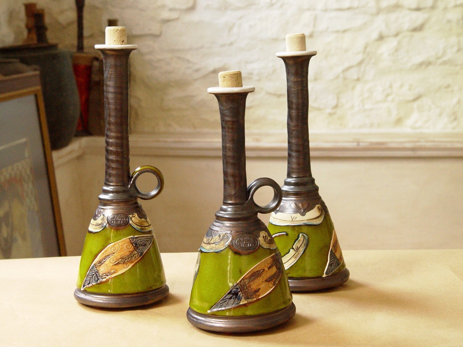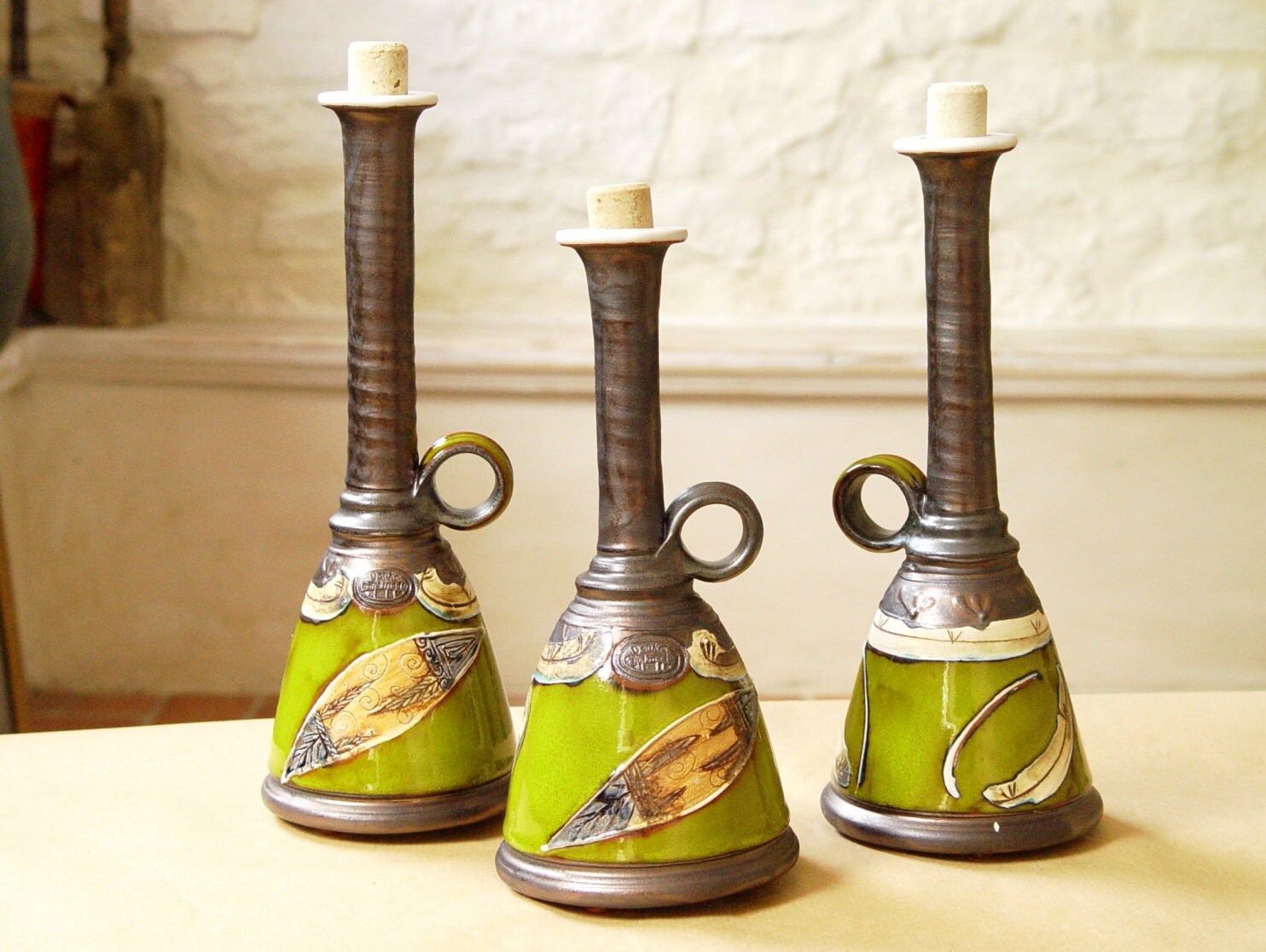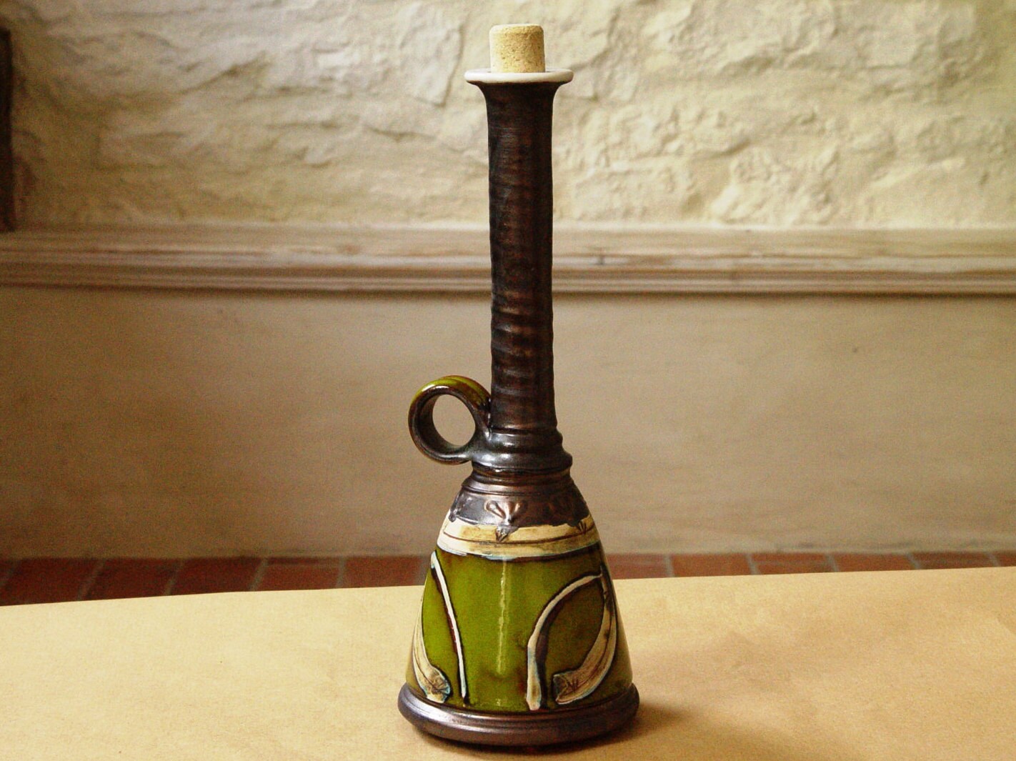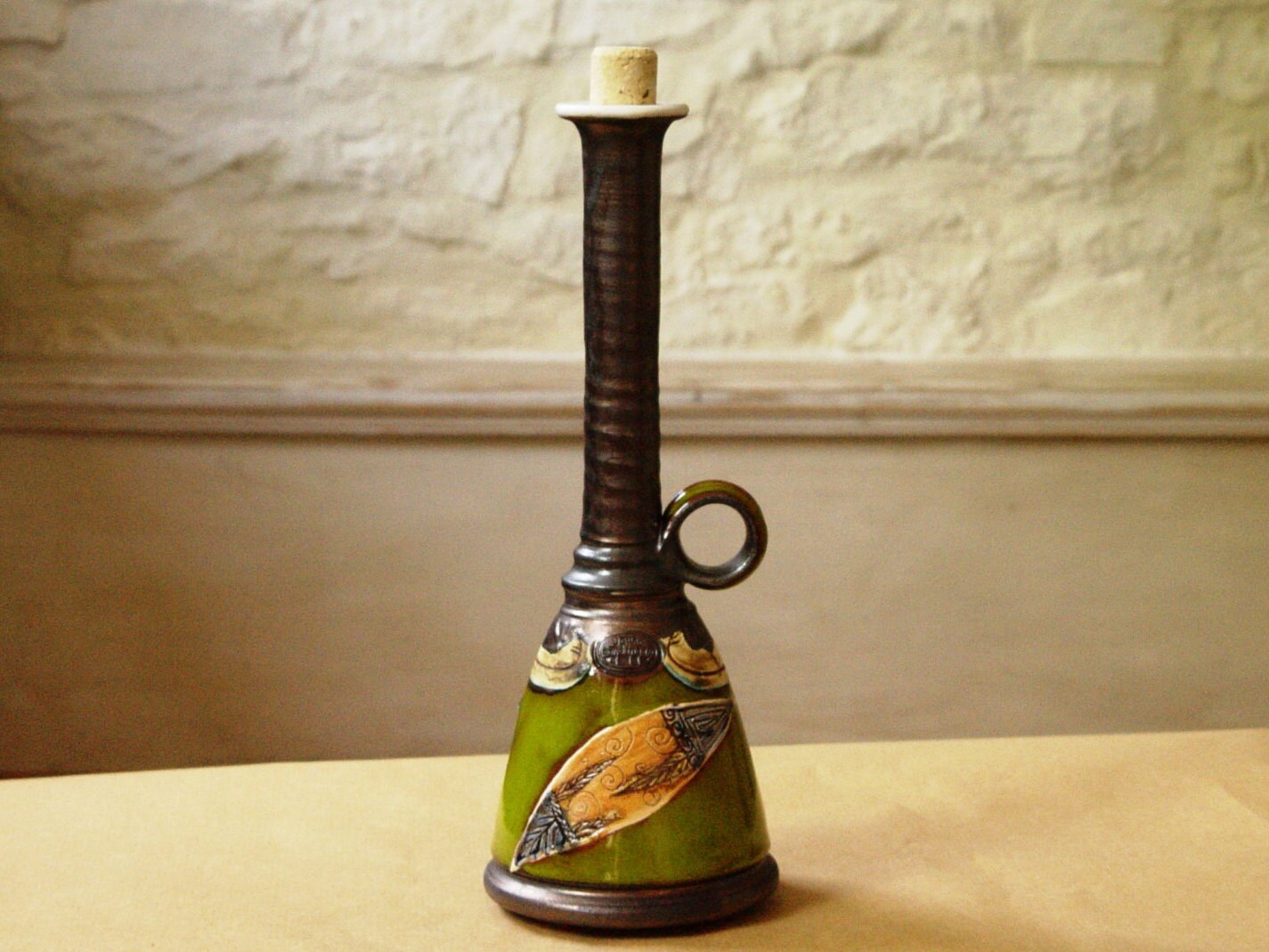 Green Pottery Bottle With Hand Painted Decoration.